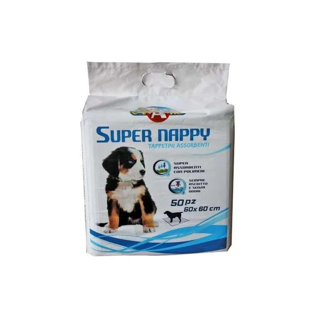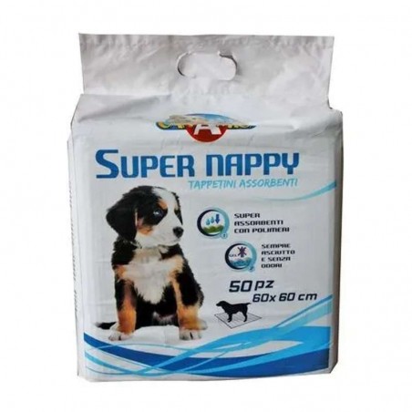 Tappetino assorbente Super Nappy: sostituisce il tradizionale foglio di giornale utilizzato per educare i cuccioli a sporcare "in quel posto". Si appoggia direttamente sul pavimento con la parte assorbente rivolta verso l'alto e la parte impermeabile rivolta verso il basso.