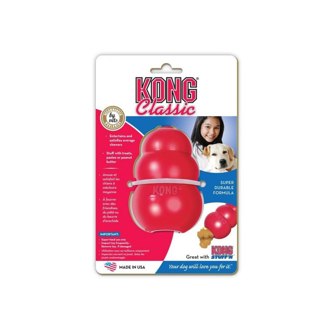 L’esclusiva formula in gomma rossa completamente naturale KONG Classic è estremamente durevole e perfetta per i cani che amano masticare e per soddisfare il loro bisogno di giocare.
