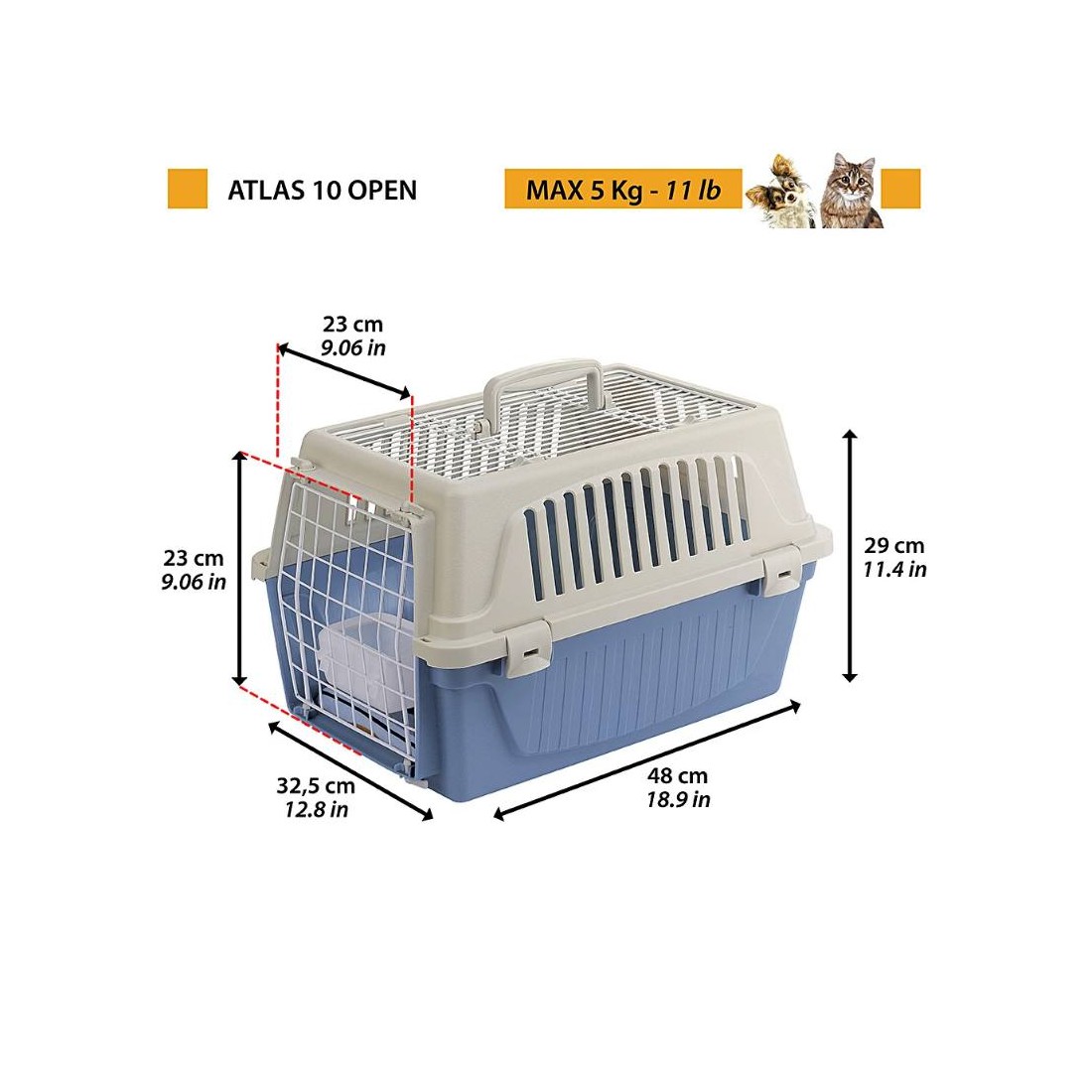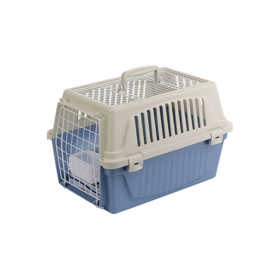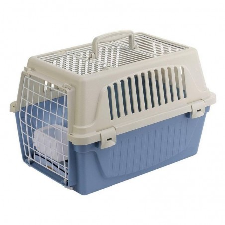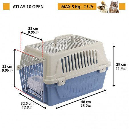 Pensato per gatti e cani di piccola taglia, il trasportino Atlas Open è perfetto per portare in giro il vostro amico. Pratico da maneggiare grazie alla maniglia fissa di cui è dotato, è adatto per viaggiare in compagnia dei vostri animali sui più comuni mezzi di trasporto (auto, treno, nave, aereo). Questo trasportino in plastica è completo di solida porta in acciaio plasticato chiudibile dall'esterno grazie ad apposite clip, in modo da evitare spiacevoli aperture accidentali durante il tragitto. Una griglia in acciaio plasticato è posta anche nella parte superiore: in questo modo il tettuccio, oltre ad essere apribile, agevola il passaggio dell'aria e permette una maggiore visibilità delll'animale.