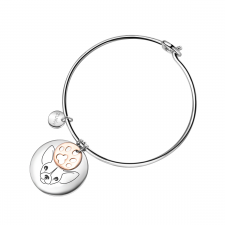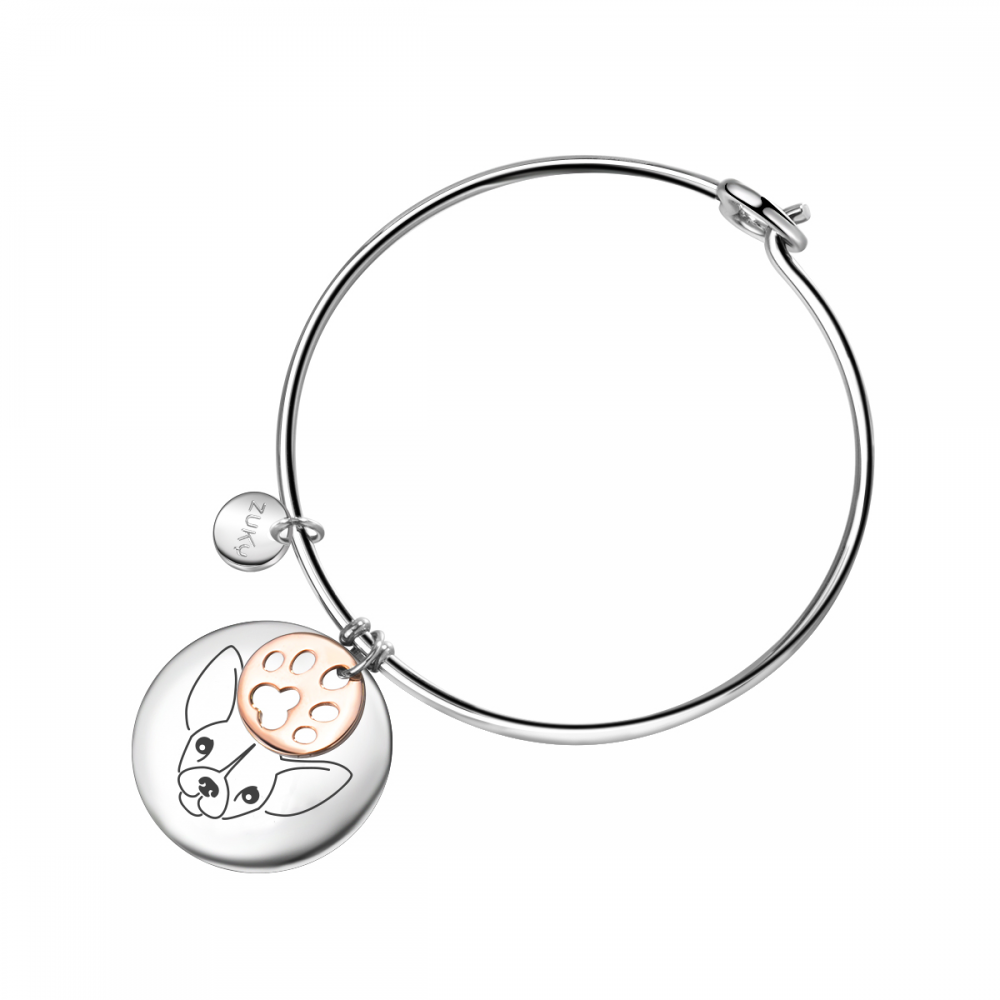 E' realizzato in acciaio e si compone di: - bracciale rigido in acciaio del diametro di 6cm con chiusura a cuore - targhetta rotonda di 2.5cm con inciso il musetto di un Bulldog Francese - un ciondolo color oro rosato a forma di zampina - un ciondolo con il logo ZUKY