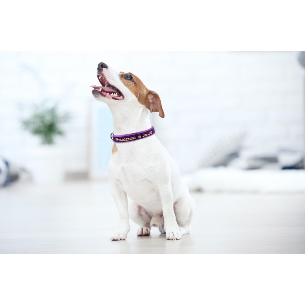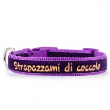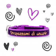Sul collare è già ricamata la frase in inglese “Strapazzami di coccole”.